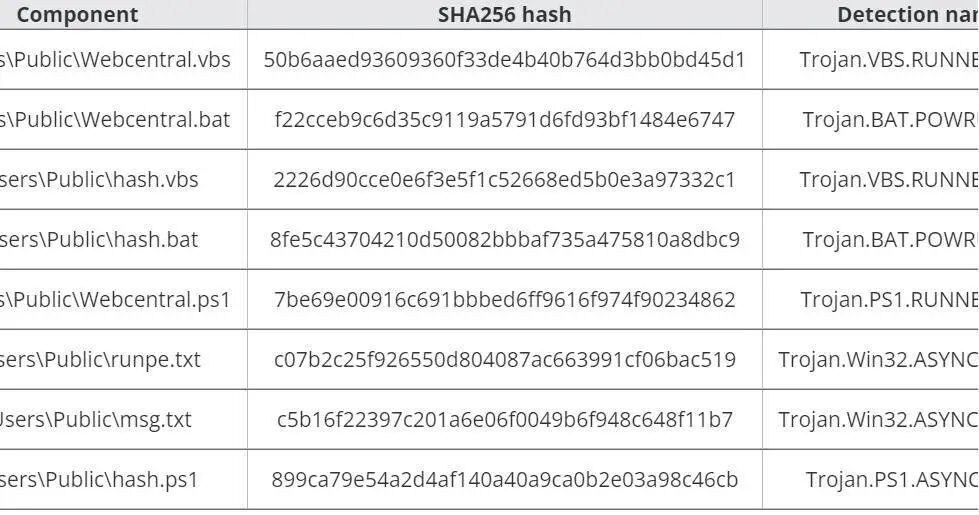 Hash.vbs与Webcentral.vbs是相同的脚本,但指向不同的文件(C:\Users\Public\Hash.bat)。