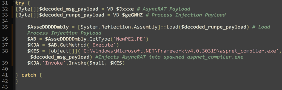 Hash.ps1解码并加载以msg.txt和runpe.txt编码的PE文件,触发aspnet_compiler.exe的执行。它使用解码后的runpe.txt中的函数将AsyncRAT有效负载(解码后的msg.txt)注入新生成的aspnet_compiler.exe进程中。