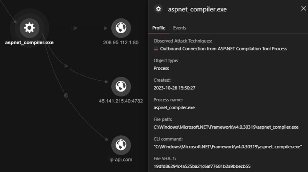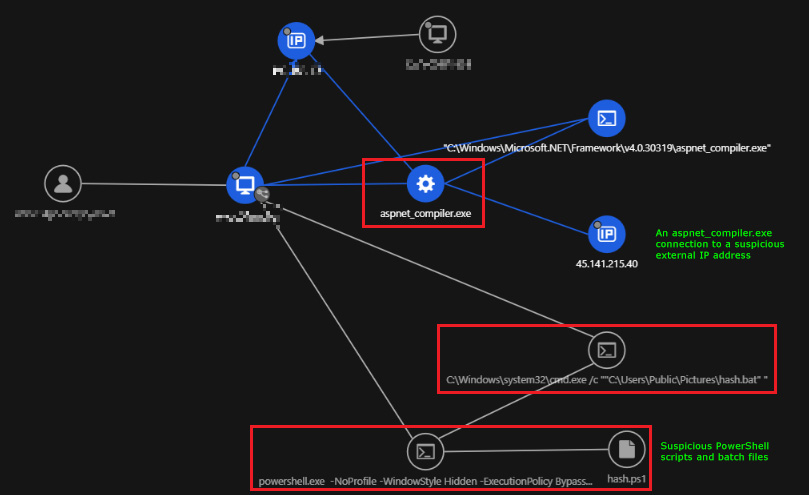 下图描述了对涉及aspnet_compiler.exe的可疑活动的检测,该活动试图与外部IP地址45[.]141[.]215[.]40建立连接。同时,我们的分析揭示了有关PowerShell脚本和批处理文件的执行情况。我们能够使用这些数据作为支点,回溯并调查文件的入口点及其附加活动。