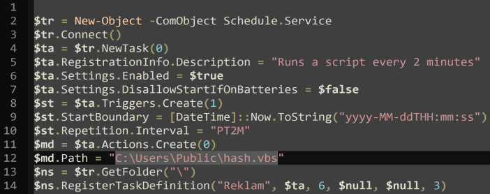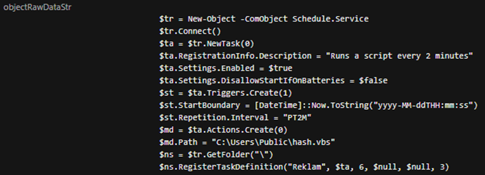 Webcentral.ps1脚本创建一个名为Reklam的计划任务,该任务每两分钟运行一次脚本(hash.vbs)。计划任务已启用,即使设备使用电池运行,也可以启动。hash.vbs脚本位于C:\Users\Public\hash.vbs目录中,作为计划任务的一个操作执行。该任务是使用Windows任务计划程序服务注册的。