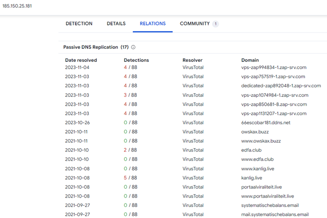 动态DNS允许攻击者快速更改与域名相关的IP地址,这对试图检测和阻止恶意活动的安全系统提出了挑战。我们最近的调查揭露了在No-IP和Dynu Systems, Inc名下注册的C&C域名。66escobar181[.]ddns[.]net域解析为IP地址185[.]150[.]25[.]181。VirusTotal分析表明,多个域被标记为恶意,都集中到同一个IP地址。