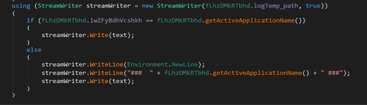 keylogging例程以与关联程序(getActiveApplicationName())对应的日志记录键结束。此交互是从临时目录中的指定日志文件中找到的。然后将信息记录在%TEMP%\Log.tmp中。