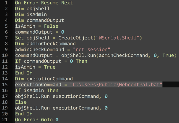脚本使用net session命令检查它是否以管理权限运行(第9-10行)。如果成功,它会向攻击者标记存在管理权限(isAdmin),然后运行存储在变量executionCommand中的命令,将其定向到批处理文件(C:\Users\Public\Webcentral.bat)。该脚本包括错误处理技术,使用On Error Resume Next和On Error GoTo 0语法来管理错误并保持脚本顺利运行。