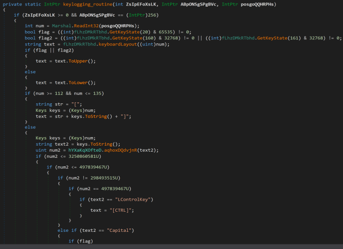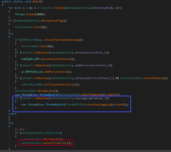 根据嵌入式配置,AsyncRAT后门具有其他功能。这包括反调试和分析检查、持久性安装和键盘记录。下图中的代码片段检查是否在嵌入式配置embeddedConfig中启用了键盘记录。如果启用了keylogging,它将启动一个新线程来执行startKeylogging方法。