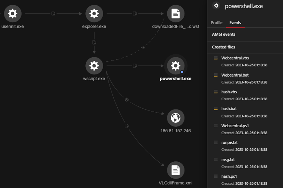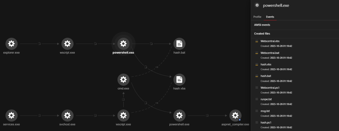 检查执行配置文件会发现wscript.exe是通过Windows资源管理器启动的,这表明用户通过双击它来执行该文件。安装顺序包括创建和执行多个PowerShell脚本(.ps1)、VBScript (.vbs)和批处理文件(.bat)。