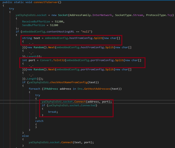 代码片段动态地从配置中选择主机和端口。AsyncRAT使用套接字连接与各种IP地址和端口进行交互,使其基础设施具有动态性和适应性。它允许攻击者频繁更改服务器地址,使预测或阻止通信通道的工作复杂化。此外,代码还包括错误处理机制,如果连接到特定IP地址或端口时出现问题,错误处理机制允许AsyncRAT尝试替代连接或退回到默认配置,从而进一步强调攻击者采用的规避策略。