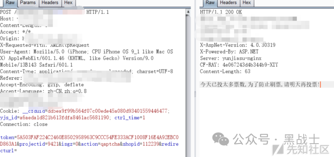 利用前面方法我们无法进行刷票了,都被限制了,这时我们可以利用并发线程,简单来说就是让服务器处理跟不上请求速度,线程还没有达到需要验证的地方已经发出去了很多请求,用Fiddler批量发包,导致服务器没有跟上处理,导致刷票,出现问题的几率比较高
