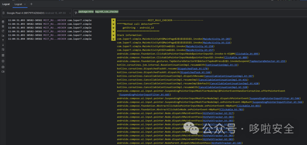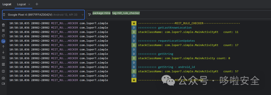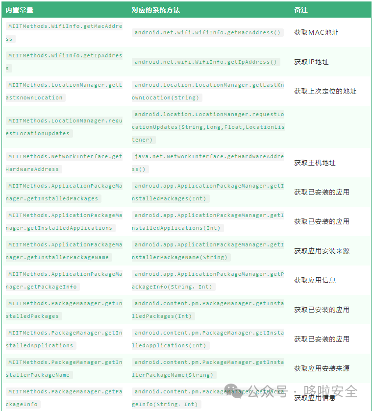 //多个方法统计 (deadline 为从方法调用开始到多少毫秒后截至统计)val list = mutableListOf<Member?>().apply {add(MIITMethods.LocationManager.getLastKnownLocation)add(MIITMethods.LocationManager.requestLocationUpdates)add(MIITMethods.Secure.getString)}MIITMethodCountChecker.startCount( 20 * 1000,list)//单个方法统计(deadline 为从方法调用开始到多少毫秒后截至统计)MIITMethodCountChecker.startCount(20 * 1000,MIITMethods.LocationManager.getLastKnownLocation)