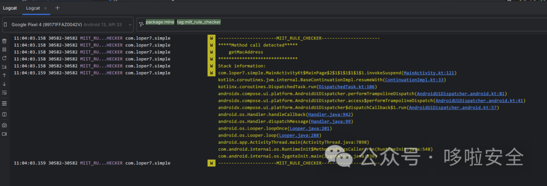 //查看 WifiInfo class 内 getMacAddress 的调用栈堆MIITRuleChecker.check(MIITMethods.WifiInfo.getMacAddress)