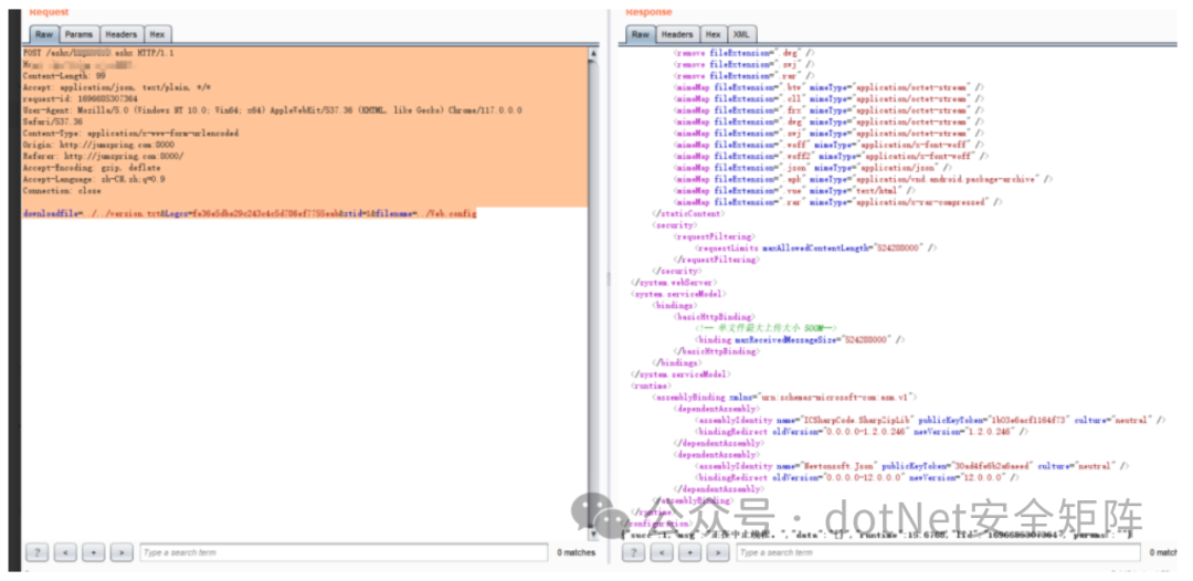 在请求体中,downloadfile字段指定了文件下载的相对路径,其中包含../../version.txt,而filename字段则包含了../Web.config,可能使攻击者能够越过应用程序的目录边界,访问敏感文件或执行未经授权的操作。
