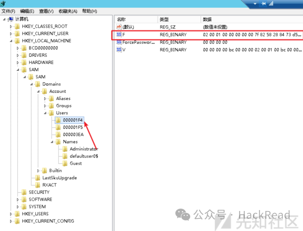 将 administrator 对应目录中的F值复制到后门用户对应目录中的F值