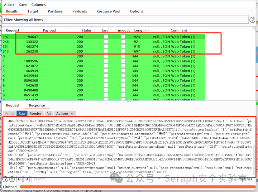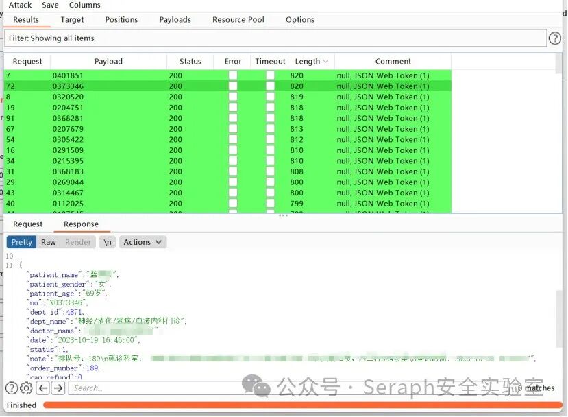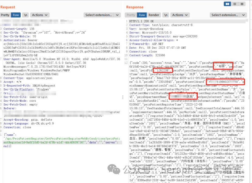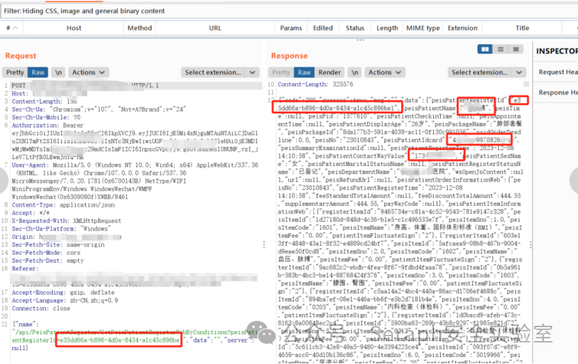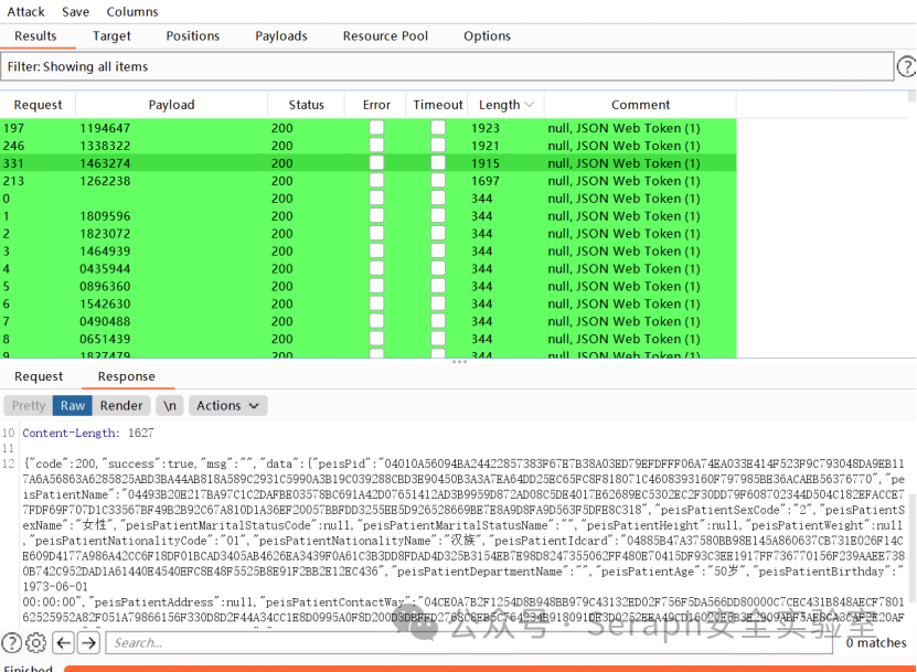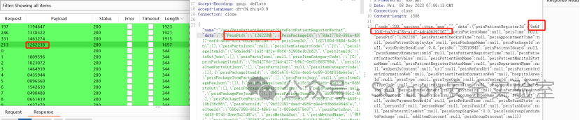 而且在返回中就可以看到用户详细的身份信息了如下,那我们直接对ZlhisInspectionService.57170028 参数,遍历测试看看效果