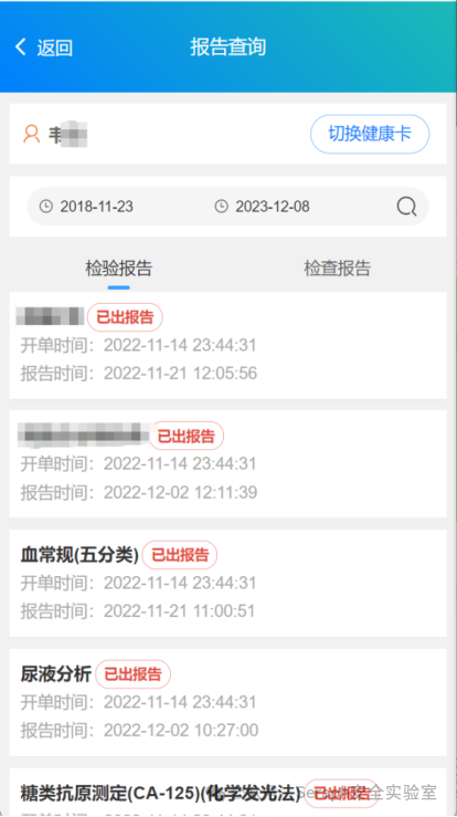绑完卡后我们再返回首页--点报告查询,把查询年份拉久一点,看看能不能查询到用户的一些检查报告,嘿嘿 果然可以