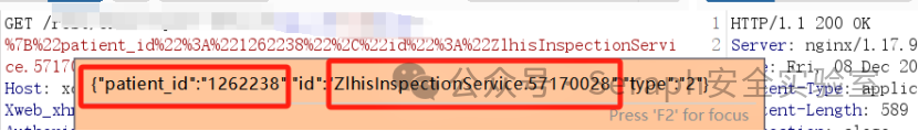 随便选择一份报告点击进入报告详情页面,然后我们在burp的分析一下数据包,数据包中的参数就俩,经过测试发现是ZlhisInspectionService.5717002这参数控制查询的