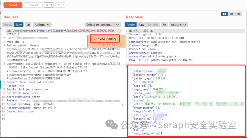 这个是订单详情的数据包,可以看到这个订单详情的数据包里面携带了用户的个人信息而且是明文的。