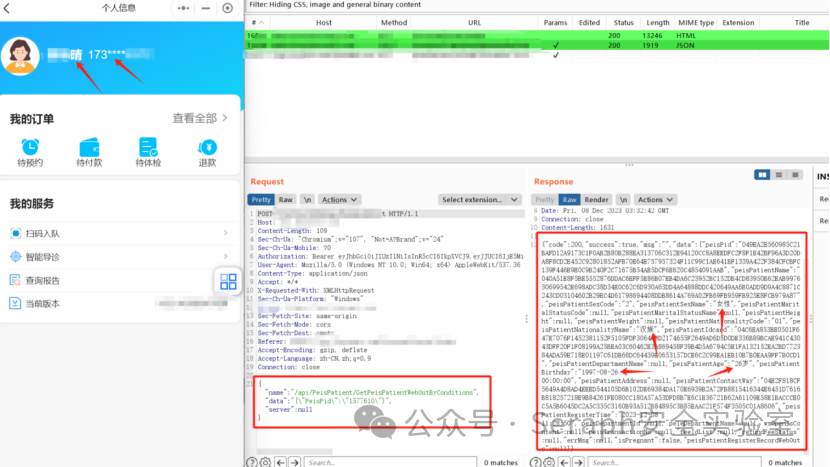 然后进入个人中心,看看有那些功能模块,这是我们发现在burp的历史请求包中有一个可控的参数PeisPid,但是可惜的是返回包的中的数据全是加密的,能得到的信息很少,只能性别、年龄、出生年月、民族等,然后前端就有个明文的姓名和加密一半的手机号—_—!