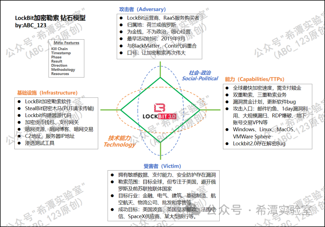 首先给大家介绍一下LockBit加密勒索家族在这些年的关键事件。早期的LockBit加密勒索软件因被加密后的文件名以.abcd结尾,所以被称之为ABCD加密勒索软件,后更名为LockBit。后来LockBit在俄语黑客论坛上发布了RaaS(加密勒索即服务)联盟计划,快速招募了很多附属机构,随着LockBit2.0及数据窃密木马StealBit的发布,开启了LockBit加密勒索组织的飞速发展和扩张,并在2022年初取代Conti加密勒索成为最有影响力的加密勒索软件。后续微软公司发现了LockBit2.0存在Bug,不支付赎金仍可解密数据。LockBit很快发布了3.0版本修复此bug,然后推出了漏洞赏金计划,发现LockBit软件bug的研究人员,可以获取1000美元到100万美元奖金。后续LockBit又发布了三重加密勒索业务,将DDoS攻击纳入业务范围以内。后续LockBit的研发人员与LockBit运营商出现争执,将LockBit的构建器公布在Github上。新版的LockBit已经开始支持Apple、Linux、FreeBSD等系统。 Part3 LockBit组织的钻石模型