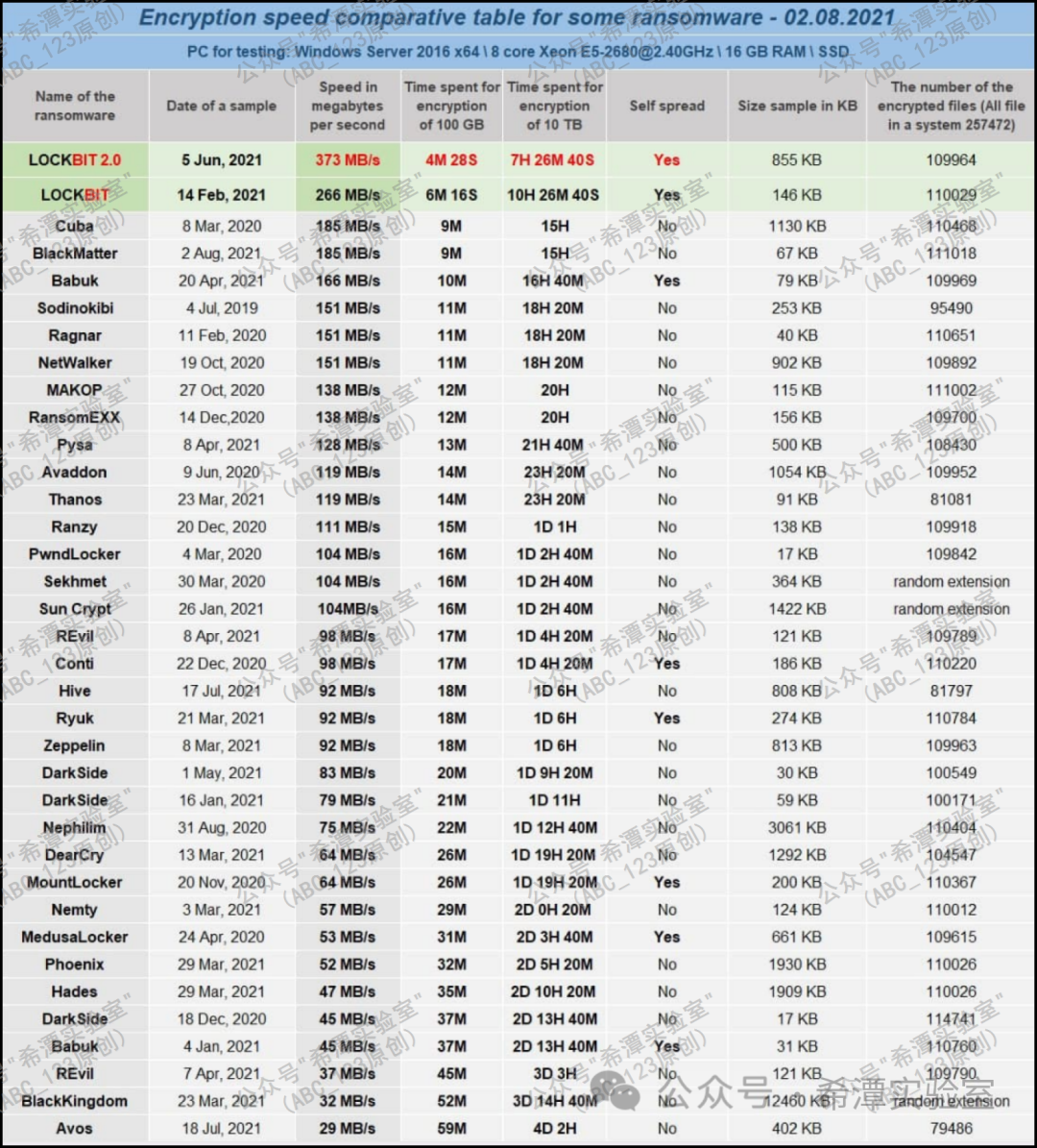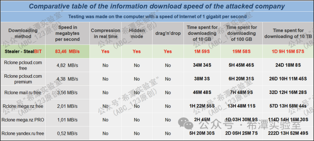LockBit 2.0是一款使用Assembly和Origin C编程语言开发的加密勒索软件,它能够攻击Windows和Linux操作系统。在2021年10月,LockBit运营商发布了一个特别针对VMware ESXI虚拟机环境的Linux版本,这个版本是用C语言编写的。LockBit组织自称其2.0版本是全球加密速度最快的勒索软件,并且公布了一份比较表来展示不同勒索软件样本的加密速度。根据这份比较表,LockBit 2.0能够在一分钟内加密大约25,000个文件。此外,暗网资料表明,LockBit的加密速率高达每秒373MB,使其在所有勒索软件中位居首位;它能够在大约四分半钟内加密100GB的数据。LockBit之所以能达到如此高的加密速度,原因在于其加密机制的设计,LockBit仅加密文件的前4KB数据。这种方法降低了加密过程所需处理的数据量,从而显著提升了其加密操作的效率。ABC_123从国外报告中检索到了LockBit的各个版本的样本图,整理总结出来,让大家对LockBit加密勒索软件有一个直观的认识。早期版本的LockBit加密勒索扩展名以.abcd结尾。LockBit2.0加密勒索的扩展名以.lockbit结尾,桌面背景会被替换,文档名为"Restore-My-Files.txt"。桌面背景会被替换,被加密文件以.HLjkNskoq或19MqzqzOs等随机形式,9位随机字符,留下文档的命名为{9}. README.txt,如QUh2IBhbp.README.txt。被加密的文件名是"1.jpg"到"1.jpg.7ec3rqvr"、"2.doc"到"2.doc.7ec3rqvr"等。在LockBit2.0推出后,LockBit的研发人员同时开发了StealBit数据窃取木马,这是一种多功能且具备高度可配置的用户数据窃取工具,它允许用户自定义多项配置,如网络限制、文件大小上限、通过关键字和文件扩展名进行文件过滤,以及开启自删除功能和探测局域网共享等功能。根据LockBit介绍,StealBit能以高达83.46MB/s的速度上传数据,这意味着它可以在短短19分钟58秒内窃取100GB的数据。LockBit 2.0的运营商还提供了一个数据传输速度的比较表,该表明确显示了StealBit与mega、yandex、pcloud等云文件共享服务商的速度差异。工具简介:Exfiltrator-22是一种新型后利用工具,目标是在企业内部网络部署加密勒索软件,同时逃避安全检测,一些证据表明EX-22可能与LockBit的前附属机构或成员有联系。EX-22于2022年11月份首次出现,在2022年12月初建立了Telegram频道以推销该工具,每月1,000美元,终身会员5,000美元,同时提供持续更新和支持。当会员订阅该工具时,他们会获得一个管理面板权限,该面板允许攻击者远程控制他们部署在受感染设备上的恶意软件。