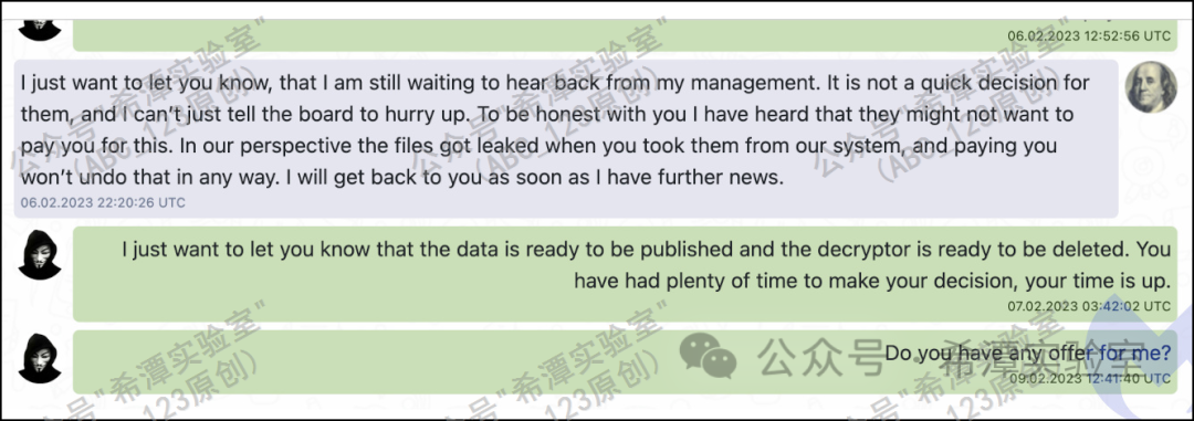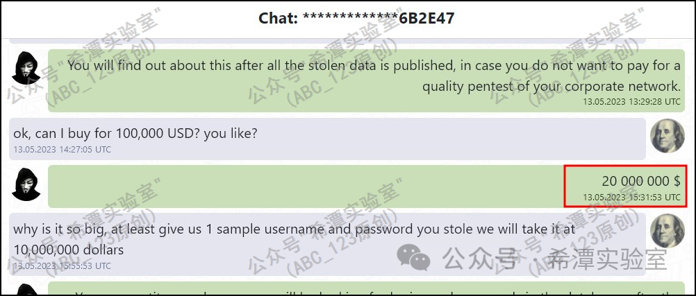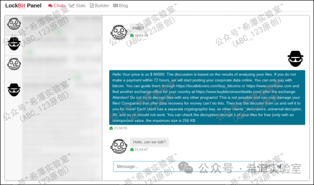 LockBit的RaaS平台专注于处理赎金支付和新功能开发的相关事务,它允许任何附属机构注册一个帐户并创建自己定制版本的LockBit勒索软件,而附属机构的攻击者可以自行决定如何投放、传播定制版的勒索软件。在受害者页面上,会显示一个“支持”聊天框,这使得能够与攻击者直接通信,勒索软件运营商通常利用这一点与受害者进行谈判,并提供额外的压力。LockBit勒索软件团伙还公开了与BSI银行谈判相关的聊天记录,LockBit运营商索要2000万美元的赎金。但是最终双方没有达成一致,LockBit最终在暗网公布了BSI银行的客户数据,包括地址数据、姓名、文件信息、银行余额、进行的交易、财务和法律文件等。以下是LockBit正在与英国皇家邮政索要8000万美元的赎金。最终谈判并未成功,因为英国皇家邮政董事会并不想为此付款,因为在他们看来,当LockBit从他们系统中获取到这些敏感文件或者数据之后,这些文件就已经泄露了,向LockBit付费并不能撤销这一行为。 4 能力(Capabilities/TTPs)