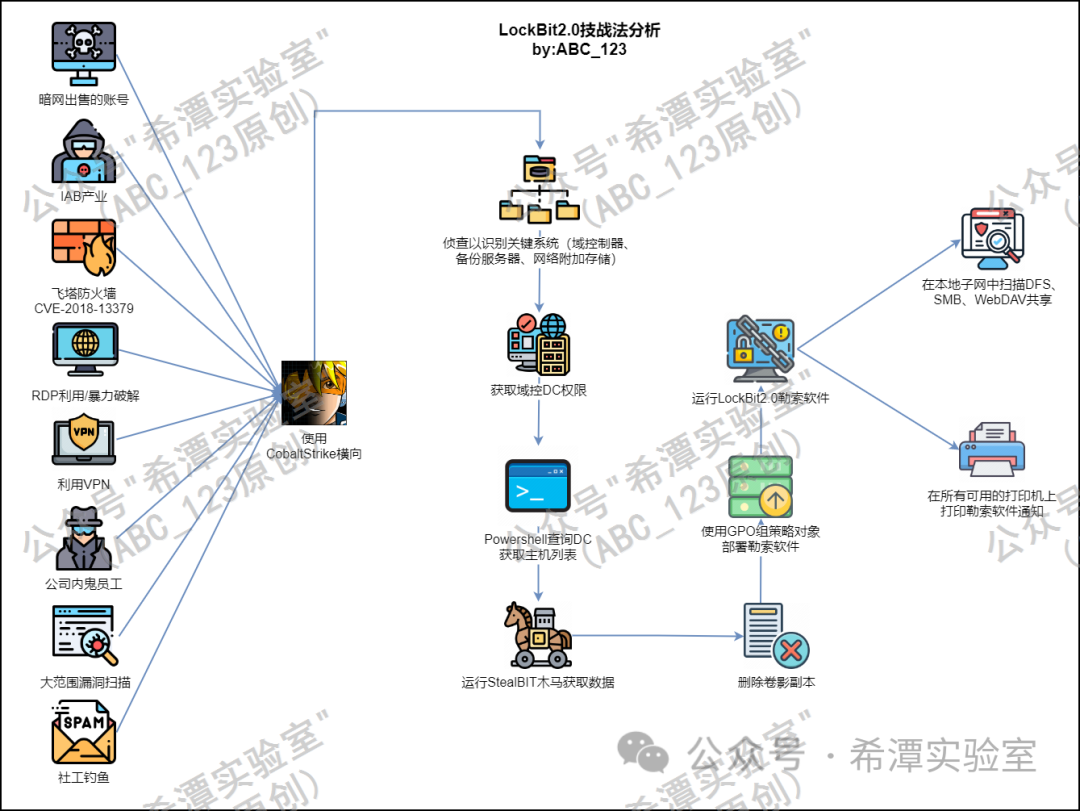 由于LockBit加密勒索组织采用RaaS运营模式,估计有上百个附属机构,各个附属机构的攻击手法均有不同。因此,各个安全研究机构捕捉到的LockBit勒索软件攻击,在攻击策略、技术和程序 (TTP) 方面存在显著差异。这种TTP差异给致力于维护网络安全和防范勒索软件威胁的组织带来了显著挑战。参考国外以往的报告,ABC_123绘制了以下技战法示意图,该图也显示了防御者应该重点关注哪些领域去防御LockBit加密勒索病毒。LockBit运营商及附属机构会想办法获取受害者的初始访问权限,用来投放加密勒索病毒,攻击手法大致分为以下几种方式: 1 大范围的漏洞扫描。利用Nday漏洞、1day漏洞、0day漏洞在资产测绘上批量扫描,也就是常说的广撒网形式。 2 公司内鬼员工。通过金钱贿赂公司内鬼员工,LockBit曾经向提供企业重要访问权限的内部人员,或者点开加密勒索邮件的内鬼人员、或者手动运行病毒程序的内鬼人员支付了多达几百万美金的报酬。 3 新出的1day漏洞。如飞塔防火墙CVE-2018-13379漏洞,Citrix NetScaler网络设备漏洞,VMware log4j2漏洞,F5代码执行漏洞等。 4 暗网出售的账号密码。包括VPN、RDP、企业邮箱账号密码。 5 IAB产业出售的权限。LockBit组织会从IAB攻击者手中购买相应权限。 6 RDP密码凭证。通过地下购买或者RDP暴力破解方式获取 8 社工钓鱼。在邮件的附件中捆绑后门,同时也有Office的宏处理后门。 Part5 总结