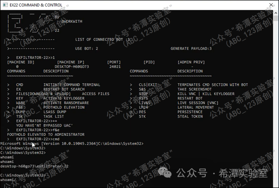 功能介绍:EX-22额外添加了增强勒索软件部署和数据盗窃的功能,同时也拥有其他后门后渗透工具的常见功能,如键盘记录功能、文件上传和下载、反弹shell功能、加密勒索功能、屏幕截图、键盘记录、实时VNC会话、权限提升、权限维持、内网横向移动、LSASS转出提取敏感信息、会话令牌窃取等。