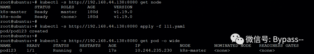 未授权访问的情况下,kubectl可以使用-s参数指定Kubernetes API服务器地址和端口,直接执行命令创建恶意Pod,将其挂载到Master节点,从而实现对整个集群的接管。