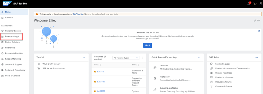 In SAP for Me (S-User required), select “Finance & Legal” Dashboard from the menu: