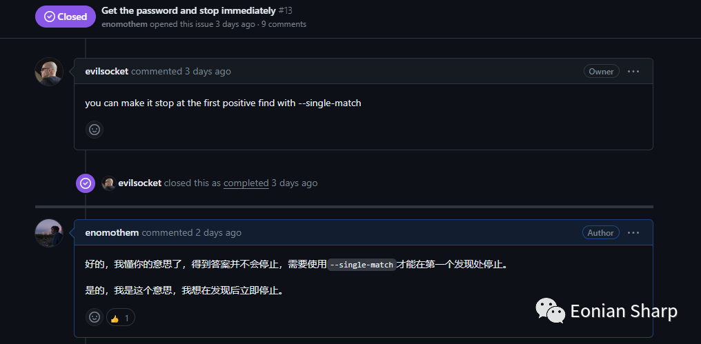 关于爆破密码成功后仍然继续爆破,作者也给出了解释,使用--single-match即可。