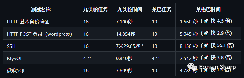 该表远不是一个详尽的基准(Hydra 根本不支持某些 Legba 功能,例如 CSRF 令牌抓取),该表仍然清楚地说明了使用异步运行时如何能够大幅提高性能。
