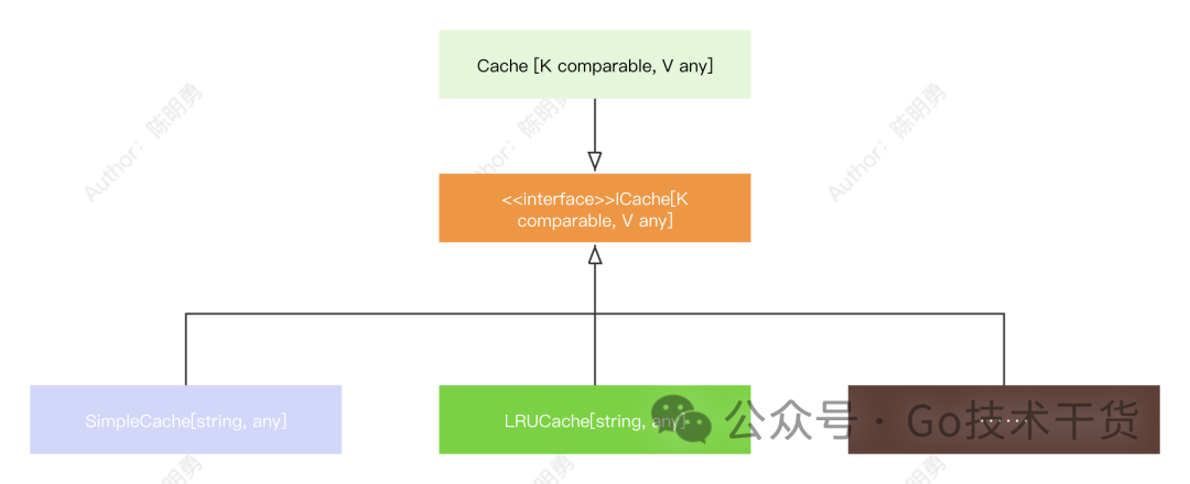 Cache[K comparable, V any]:基于策略模式的灵活、可扩展和并发安全的缓存结构体设计。ICache[K comparable, V any]:缓存 API 接口,用于定义缓存 API 规范。SimpleCache[K comparable, V any]:基于简单 map 实现的缓存实例。LRUCache[K comparable, V any]:基于 LRU 淘汰算法实现的缓存实例。首先,定义一个 ICache 接口: