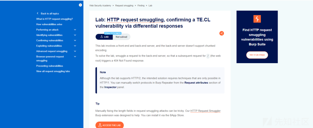靶场地址:https://portswigger.net/web-security/request-smuggling/finding/lab-confirming-te-cl-via-differential-responses