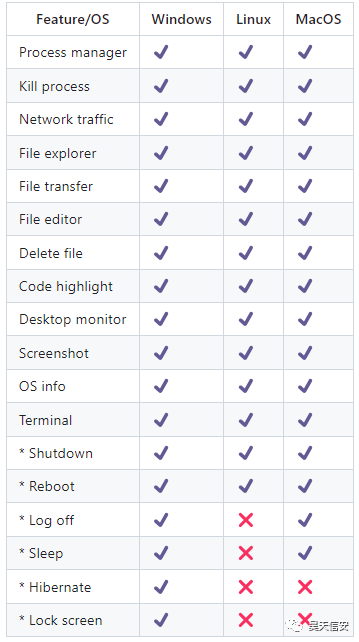 listen 必填,格式为 IP:端口salt 必填,修改后需要重新部署客户端,长度不大于24auth 选填,格式为 用户名:密码$算法$密文,例如$sha256$11223344556677AABBCCDDEEFFsha256,sha512和bcryptlog 选填,日志配置level 选填,可选值:disable, fatal, error, warn, info, debugpath 选填,默认为./logsdays 选填,默认为7目前 Spark 支持主流的三个系统 Windows、Linux、MacOS,功能基本在三个系统上都支持,有部分差异。功能列表如下图: