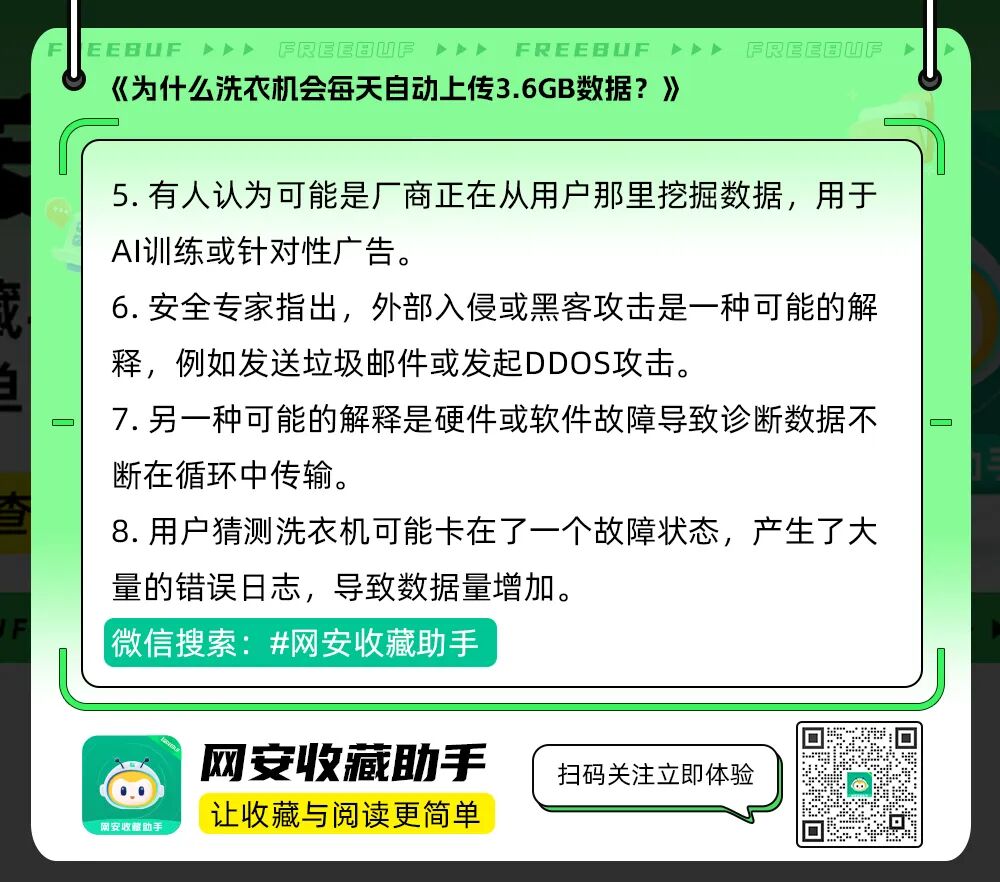 对于“洗衣机上传GB级数据”,有安全专家指出,一种可能的简单解释是外部入侵或黑客攻击。例如在2017年,Check Point的研究人员发现了一个安全漏洞,它允许远程攻击者控制账户和连接的设备。“我猜测它要么被用来发送垃圾邮件,要么用来发起DDOS攻击。这是我能想到的导致大量出站流量和非常轻微入站流量的唯二原因。”