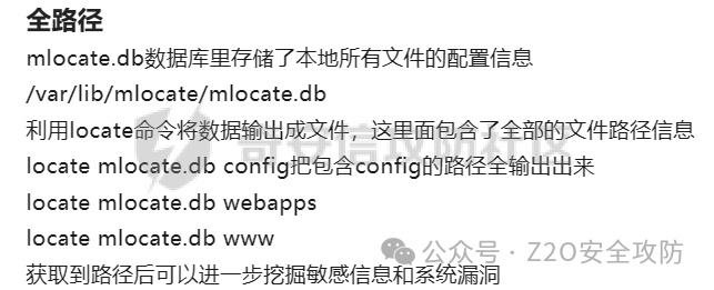 Linux下有mlocate.db文件,此文件介绍如下,我可以下载这个文件,再从这个文件中获取其他文件的绝对地址,这样的话我就可以下载到目标服务器上任意的文件了