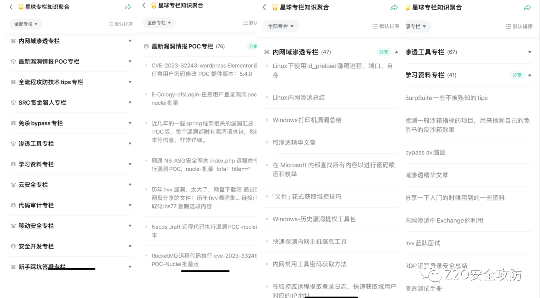 涉及方向包括Web渗透、免杀绕过、内网攻防、代码审计、应急响应、云安全。From Zero To One ,星球针对网络安全成员的普遍水平,并为星友提供了教程、工具、POC&EXP以及各种笔记等等,循序渐进的方式引导加深安全攻防技术提高。