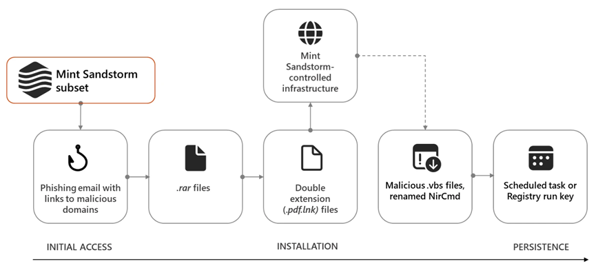 自 2023 年 11 月以来,研究人员观察到 Mint Sandstorm (PHOSPHORUS) 的一个独特子集针对比利时、法国、加沙、以色列、英国和美国的大学和研究组织中从事中东事务的知名人士。在此活动中,Mint Sandstorm 使用定制的网络钓鱼诱饵,试图通过社会工程手段让目标下载恶意文件。在少数案例中,研究人员观察到了新的入侵后技术,包括使用名为 MediaPl 的新的自定义后门。