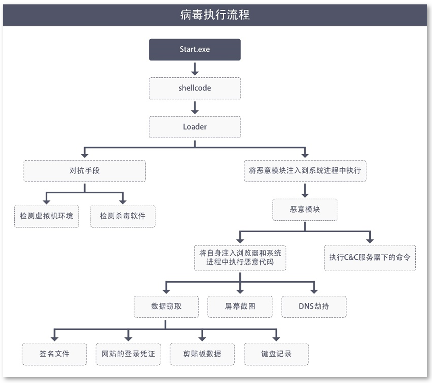 病毒运行后,首先,会使用对抗手段检测虚拟机环境和杀毒软件,捕获的变种样本使用了多种对抗手段,除了采用shellcode分块执行外,还通过PUSH RET来混淆IDA反编译的调用流等手段对抗杀软;随后,将恶意模块注入到系统进程中执行,进行数据窃取、屏幕截图、DNS劫持等恶意操作。