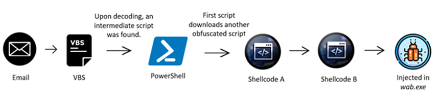 此活动展示了由通过电子邮件传递的 VBS 文件启动的全面感染过程。从激活 VBS 脚本开始,它会经历 PowerShell 阶段,利用 BitsTransfer 实用程序获取第二阶段 PowerShell 脚本。解码并执行的 Shellcode A 隐藏并加载 Shellcode B。在最后阶段,wab.exe 下载加密的 Remcos RAT 有效负载。Shellcode B 被解密并注入到 wab.exe 中,使其充当 Remcos RAT。