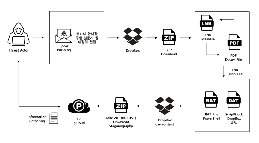 伪装成活动公告的恶意文件被操纵为 Google 表单链接并从 Dropbox 下载 。下载的 ZIP 压缩文件类型恶意文件中存在快捷方式,攻击者尝试以典型 APT37 组织鱼叉式网络钓鱼攻击的方式通过 pCloud 泄露信息。此次APT攻击案例结合无文件和加密技术的应用以及正常的云服务通信,具有APT37组织典型的ROKRAT攻击链特征。该威胁行为者正在构建详细的黑客场景,从攻击前准备到侦察和渗透。