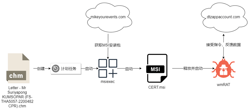 据悉,蔓灵花本次主要向我国军工行业投递带有恶意程序的钓鱼邮件附件,附件内含有恶意的CHM文件。一旦受害者点击CHM文件,就会在本地创建计划任务。该计划任务会设定每隔15到20分钟与攻击者远程服务器通信一次,继而下载MSI文件,然后在受害者电脑内植入wmRAT后门程序。其中,wmRAT作为蔓灵花组织的标志性武器,于2022年被首次披露,披露时远控指令只有16个,并且有一半的指令无实际功能,这表明蔓灵花正在积极开发该后门程序。wmRAT后门设计巧妙,不仅可规避静态查杀,还能够规避沙箱的行为检测。此次攻击中的wmRAT后门则具备截取屏幕图像、上传文件数据、获取指定URL页面内容、遍历磁盘、下载文件等恶意功能,因此具有很强的威胁性。