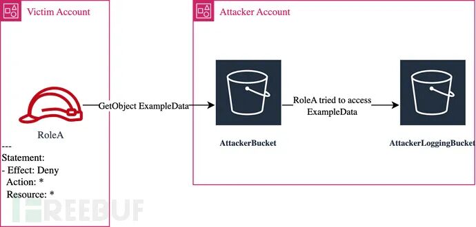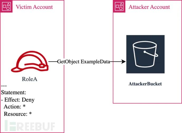 此时,威胁行为者可以控制目标用户中的RoleA,而RoleA的权限中明确规定了不允许对目标环境执行任何操作或资源访问。那么在这种情况下,威胁行为者是否能够成功利用RoleA实现数据泄露,并将数据提取到不同账户中的AttackerBucket呢?