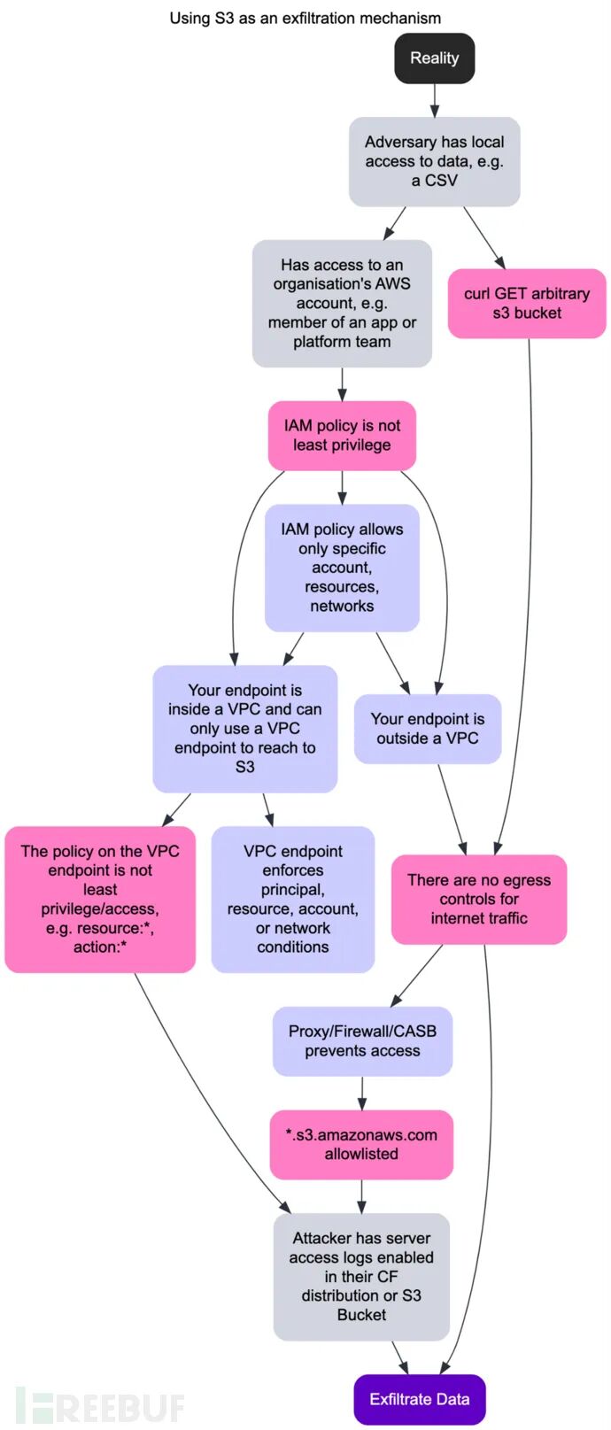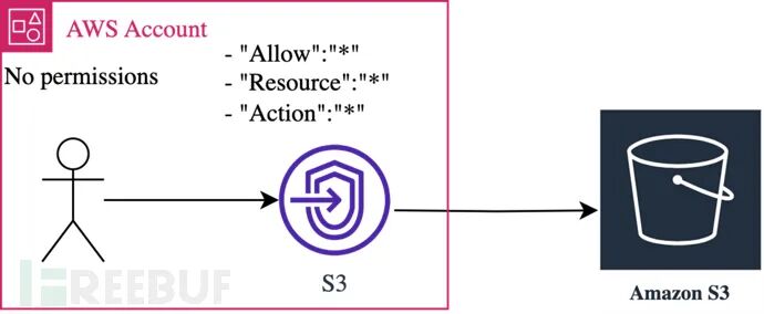 在一个VPC内,威胁行为者需要一个泄露的VPC节点,例如一个允许将请求转发到S3服务器的节点。这样一来,威胁行为者不需要其 IAM 角色的任何权限即可请求访问 S3 服务和数据资源。