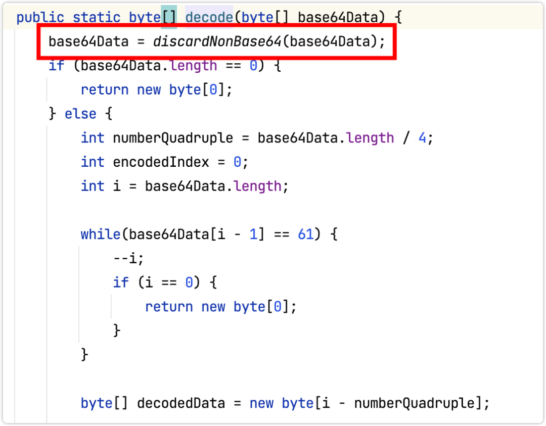 如图,在shiro解码base64字符串的过程中,会调用discardNonBase64方法去除掉非Base64的字符