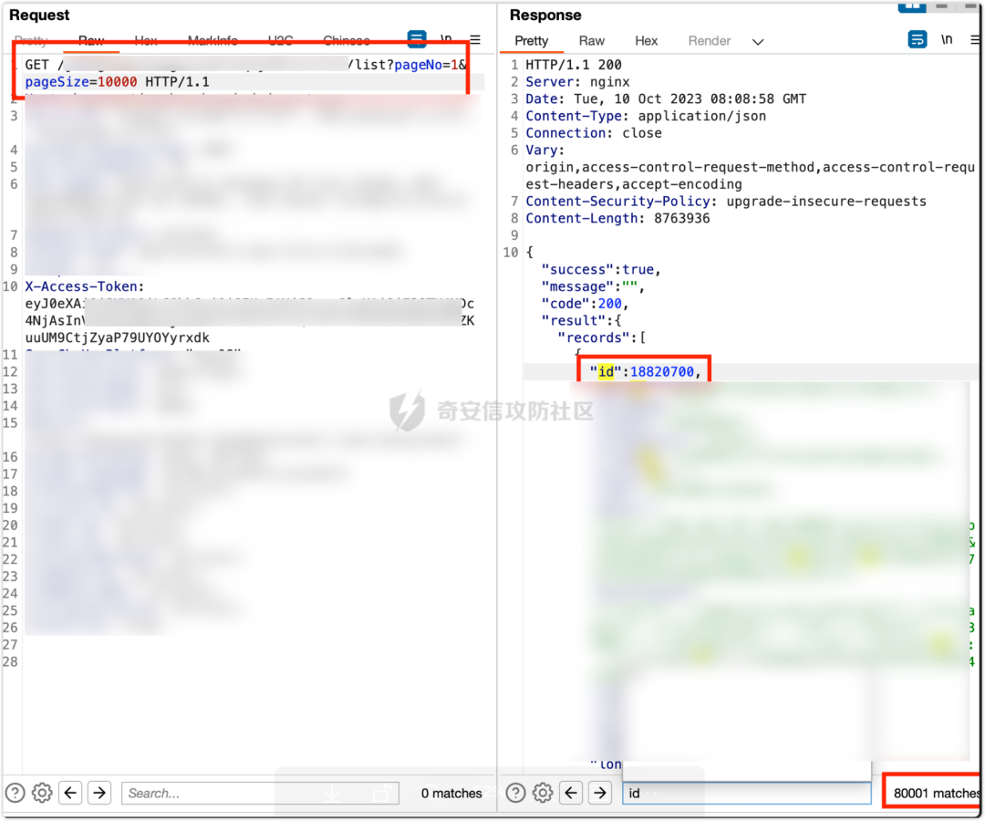 使用该JWT,通过webpack提取到的api,访问后端API,拿下大量敏感信息,达千万量级,防止burp卡死,仅列出部分