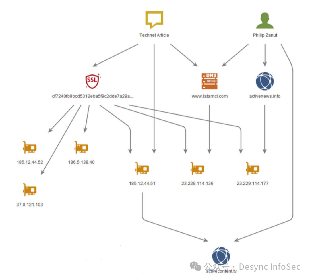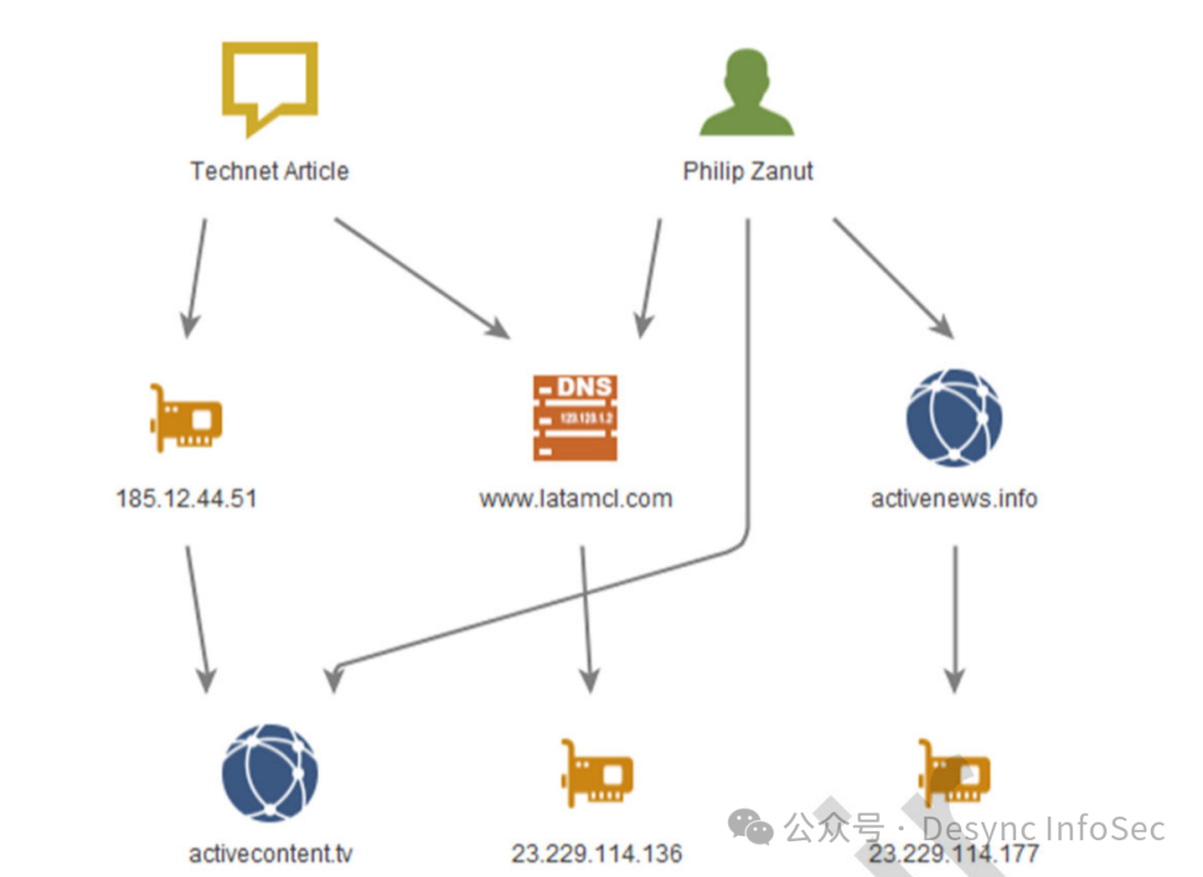 根据当年的情报数据,IP:185.12.44.51 存在另一个域名的解析记录,activecontent.tv。同时,域名:www.latamcl.com存在另一个IP的解析记录:23.229.114.136。并且查询这个域名的Whois信息,我们得到了域名的注册人信息:Philip Zanut。根据这个注册人,我们找到了他注册的另一个域名:activenews.info。该域名解析到IP:23.229.114.177。这个IP与第一个域名解析到的IP属于同一个C段。