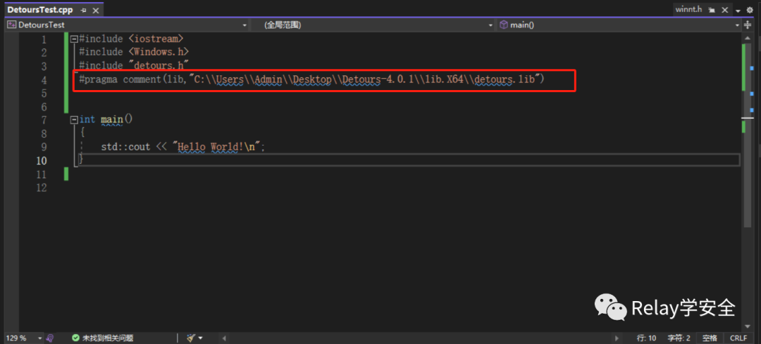 最后将其通过#pragma comment进行引入即可。需要注意的是还需要将detours.h头文件引入。