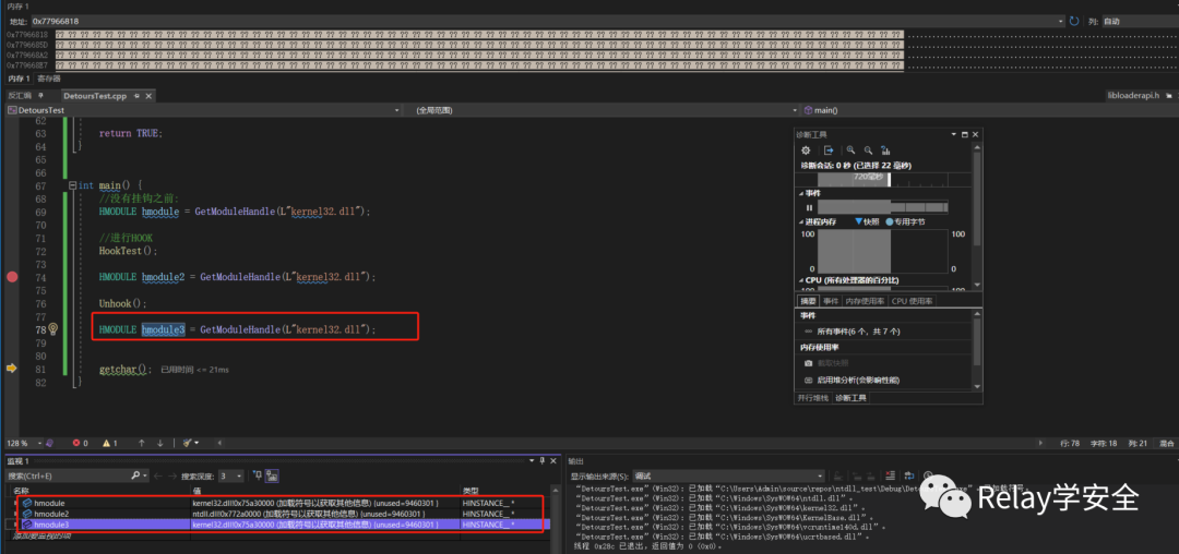 DetourTransactionBegin 附加或分离新事务,挂钩或取消挂钩应首先调用此函数。DetUpdateThread 更新当前事务。Derours库是使用它来登记当前事务中的线程。DetourAttach 在当前事务的目标函数上安装挂钩 在调用DetourTransactionCommit之前此操作不会提交。DetourTransactionCommit 提交当前事务以附加或者分离。