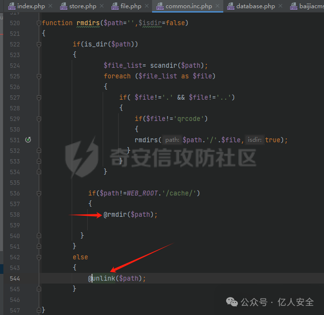 common.inc.php中的rmdirs函数同样调用了unlink函数,并且发现还调用了rmdir函数