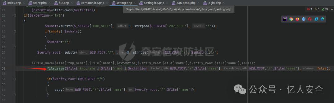 接下来寻找file_save函数调用的地方,主要关注第四个参数是否可控即可,在/system/weixin/class/web/setting.php中找到一处调用