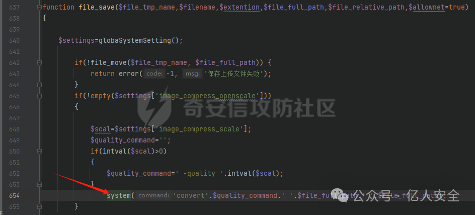 全局搜索这些函数,找到在common.inc.php文件中存在一处file_save函数调用system()